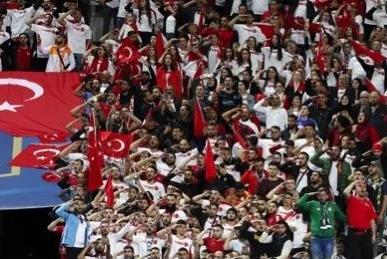但令法国乃至西方舆论更加不满的是,不仅土耳其球员再次在进球后做出了“敬军礼”的动作,而且这次连看台上的土耳其球迷也都跟着一起做出了这一动作……