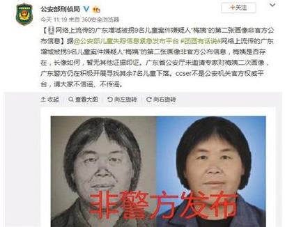 公安部刑侦局官方微博和公安部儿童失踪信息紧急发布平台官方微博11月18日上午发布消息称,网络上流传的广东增城被拐9名儿童案件嫌疑人“梅姨”的第二张画像非官方公布信息。