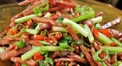 在腌制前,需要根据肉量配佐料,除了盐、白糖、米酒之外,每家还有自己独特的入味古法,一般女人都会用这样的方式为晒兰打上仅属于自己独特印记,腌制是个入味的过程,在寒冷的冬天一般腌制10-12个小时,接下来要做的就是要把腌制完的肉用篮子盛着,放在外面晒着,当风寒带走水分的同时猪肉就能承载思念,繁琐的做法只需要简单的烹饪,船工漂泊一天,需要补充食物的时候就会在篮子里取出一块,切成肉丝,和辣椒炒在一起鲜美的味道也十分下饭。