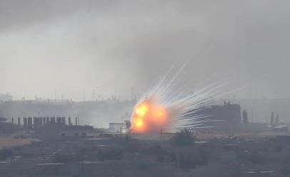 从土耳其边境可以看到叙利亚城镇拉斯埃恩发生爆炸升起滚滚浓烟